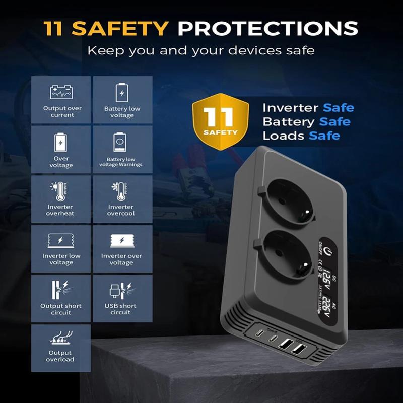 - Korkea hyötysuhde ja suorituskyky - Tarjoaa yli 90 % muuntotehokkuuden muunnetulla siniaaltolähdöllä, mikä takaa vakaan ja turvallisen virran useimmille kotitalouksille ja digitaalilaitteille.