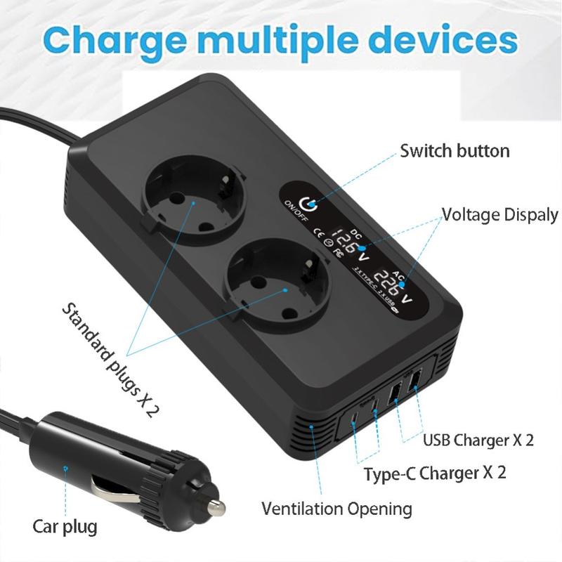 200W 12V DC 220V AC autovirtamuuntaja - kaksi eurooppalaista pistorasiaa, joissa on USB- ja C-tyypin pikalatausliitännät