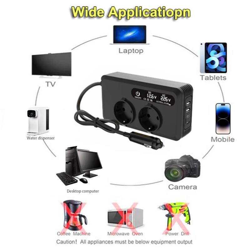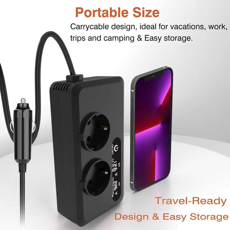 - Tehokas virranmuunnos - Muuntaa 12V DC:n 220V AC:ksi 200W:n jatkuvalla teholla ja 400W:n huipputeholla, joka on ihanteellinen useimmille matkoille ja jokapäiväiselle elektroniikalle.