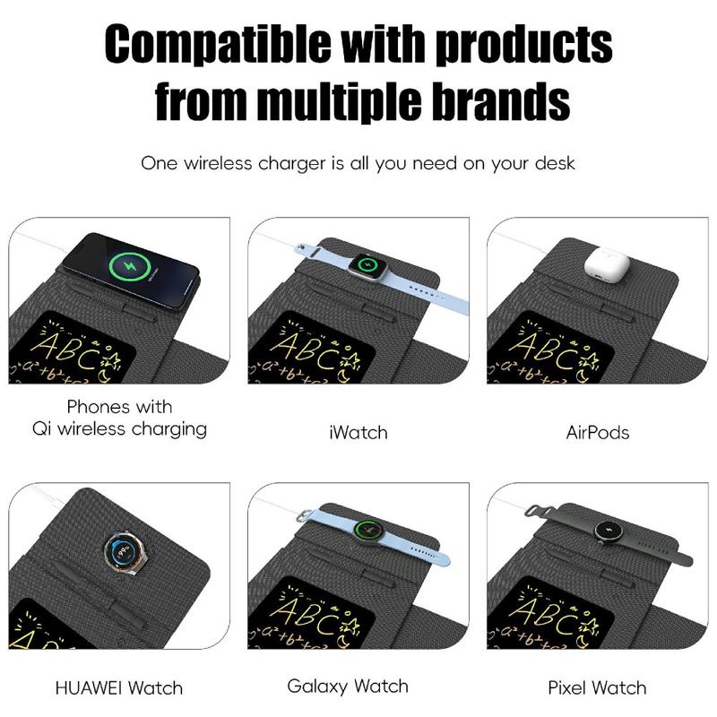 Tämä monitoiminen taitettava hiirimatto on suunniteltu tehostamaan työympäristöäsi kokouksissa, toimistotyössä tai matkoilla. Se yhdistää langattoman latausalustan, säädettävän puhelintelineen, hiirimaton ja digitaalisen kirjoitustaulun tyylikkäässä, kannettavassa muodossa. Magneettisen pikalatauksen ja sisäänrakennetun kynän ansiosta se auttaa sinua pysymään järjestyksessä, virralla ja tuotteliaana missä tahansa työskenteletkin.