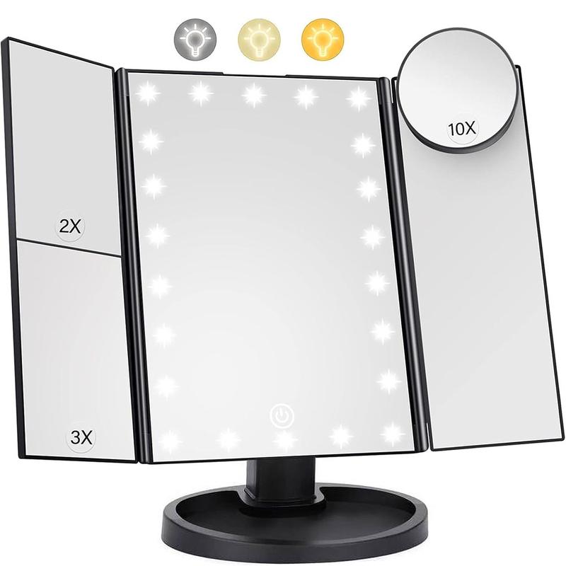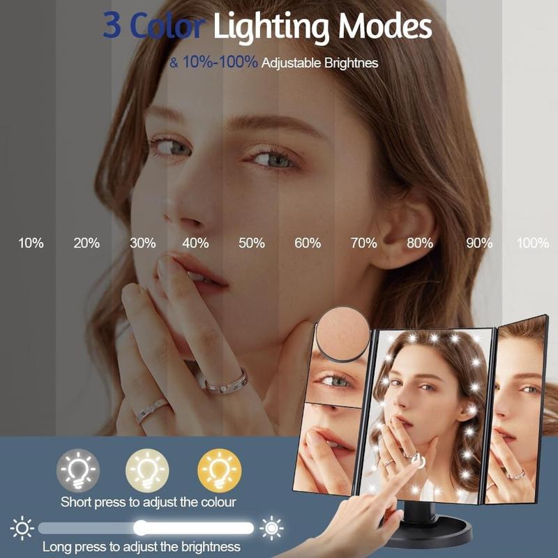 3-puoleinen kokoontaitettava meikkipeili 22 LED-valolla - 1X/2X/3X/10X suurentava turhamaisuuspeili - 1X/2X/3X/10X suurentava turhamaisuuspeili