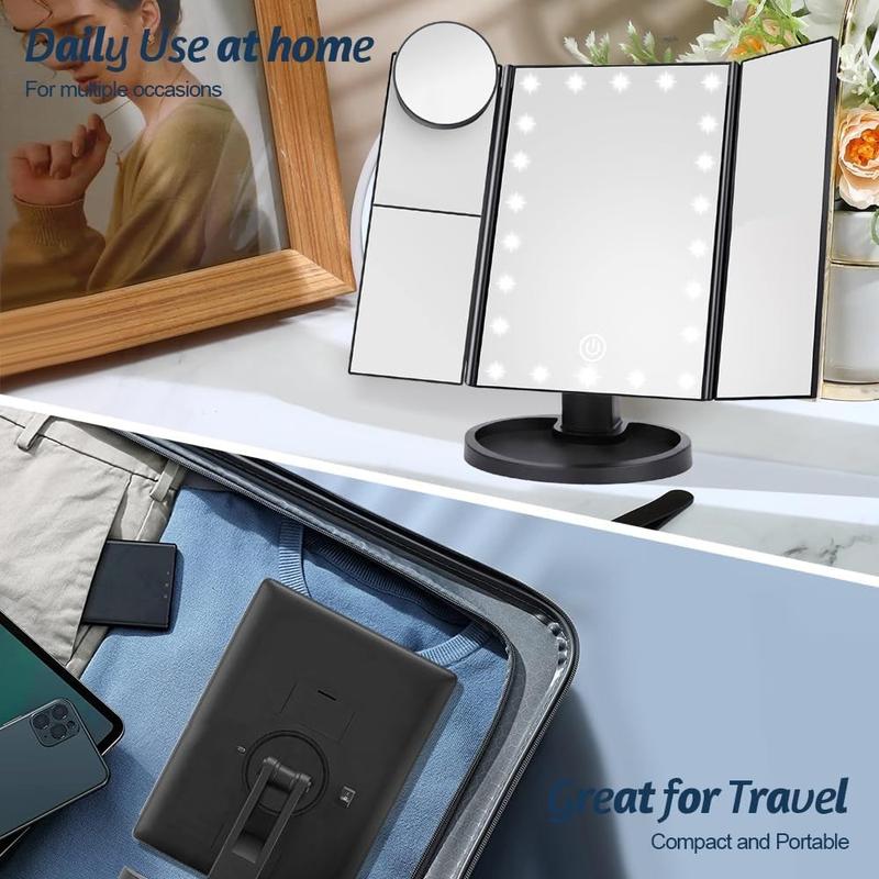 - Laajakulmainen näkymä - Kolmipaneelinen muotoilu tarjoaa kattavan näkymän kasvoihisi, mikä helpottaa meikin ja kampauksen jokaisen kulman täydellistämistä.