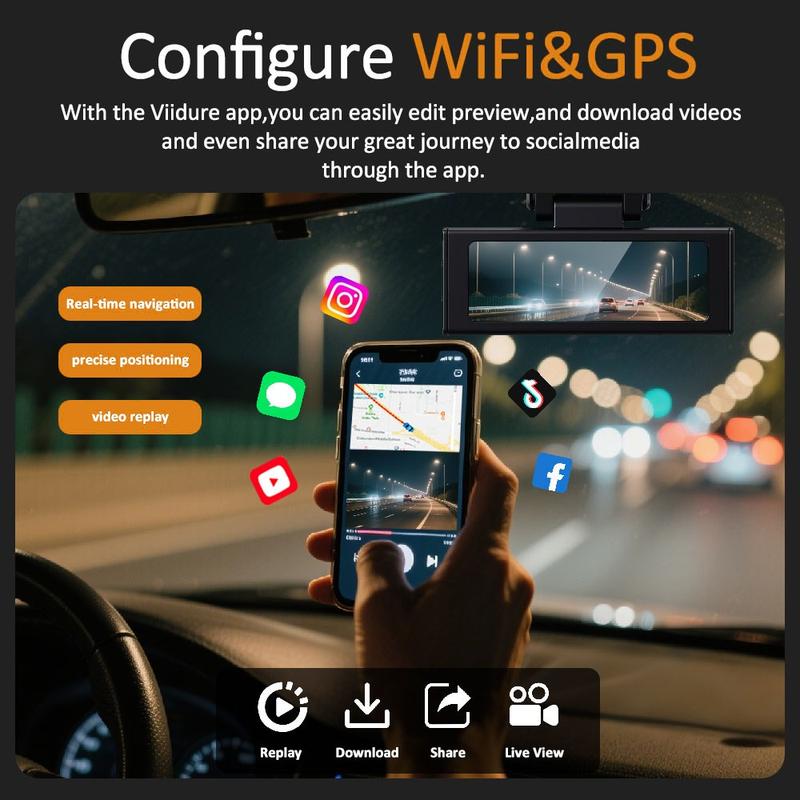 Sisäänrakennetun Wi-Fi-yhteyden avulla voit liittää kojelautakameran suoraan älypuhelimeesi ja toistaa, ladata tai jakaa videotiedostoja välittömästi - muistikorttia ei tarvitse poistaa. Integroitu GPS-moduuli seuraa ajoreittejä ja sijainteja ja tarjoaa tarkat karttatiedot matkan dokumentointia tai onnettomuuksien todentamista varten. ADAS-ajotuki lisää turvallisuutta älykkäillä hälytyksillä, jotka edistävät varovaisempaa ajamista.
