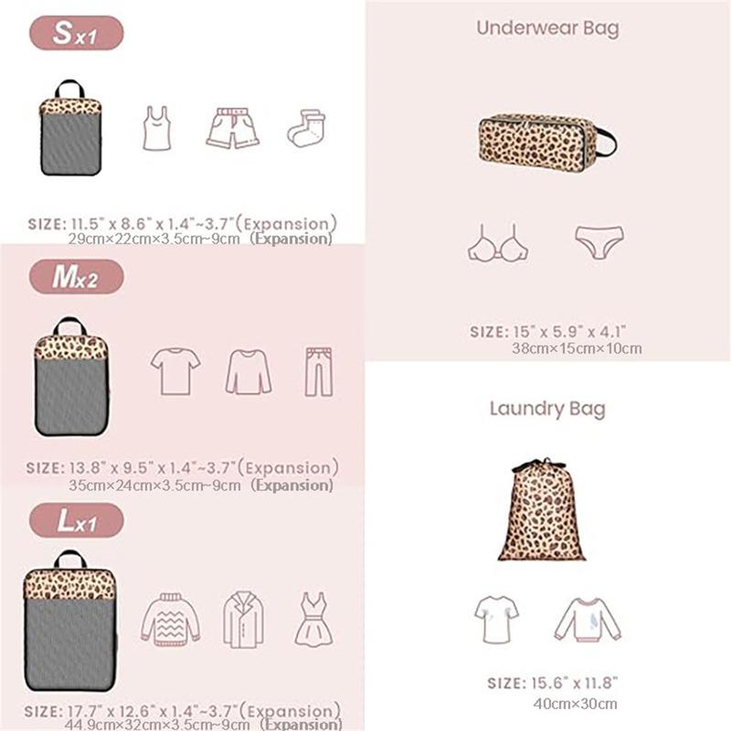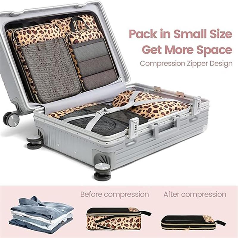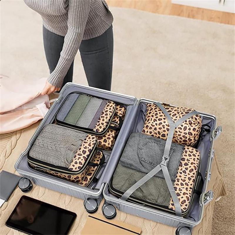 6-osainen setti matkaorganisaattoreita leopardikuviolla - Tilaa säästävät pakkauspussit vaatteille ja hygieniatuotteille