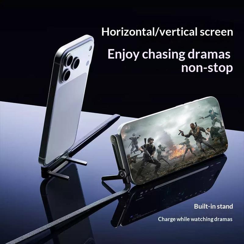 Lataa, pelaa ja tee useita asioita samanaikaisesti entistä mukavammin tällä 90 asteen USB-C-USB-C-pikalatauskaapelilla, jossa on sisäänrakennettu taitettava puhelinteline. Se on suunniteltu suuritehoiseen USB-C Power Delivery -lataamiseen jopa 240W:n teholla ja tarjoaa vakaata virtaa yhteensopiville puhelimille, tableteille ja kannettaville tietokoneille. Kulmainen liitin vähentää kaapelin rasitusta ja pitää pistokkeen poissa tieltä pelatessa, kun taas integroitu teline tukee sekä pysty- että vaakasuuntaista katselua, jotta voit käyttää laitetta kädet vapaana työpöydällä tai matkoilla.