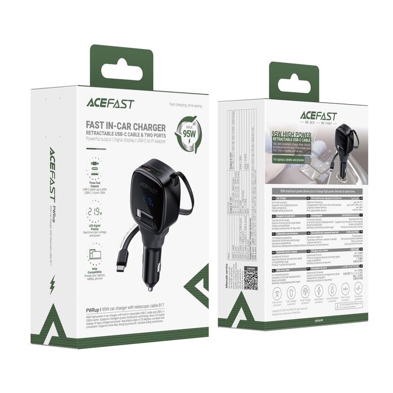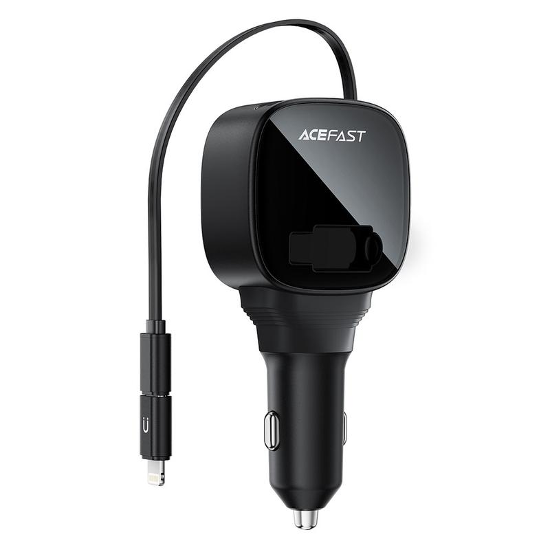 Acefast B17 95W nopea autolaturi - USB-C/USB-A LED-näytöllä ja sisäänvedettävällä kaapelilla varustettuna