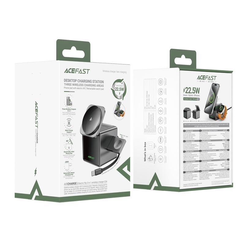 Langattomat 3-in-1-latauslaitteet säästävät energiaa ja tilaa yhdistämällä useita latauskeloja yhteen yksikköön. ACEFAST E34:n sähköinen flip-ominaisuus on innovaatio, joka on saanut inspiraationsa säädettävistä näyttöjalustoista ja tarjoaa sekä ergonomista mukavuutta että lataustehokkuutta.
