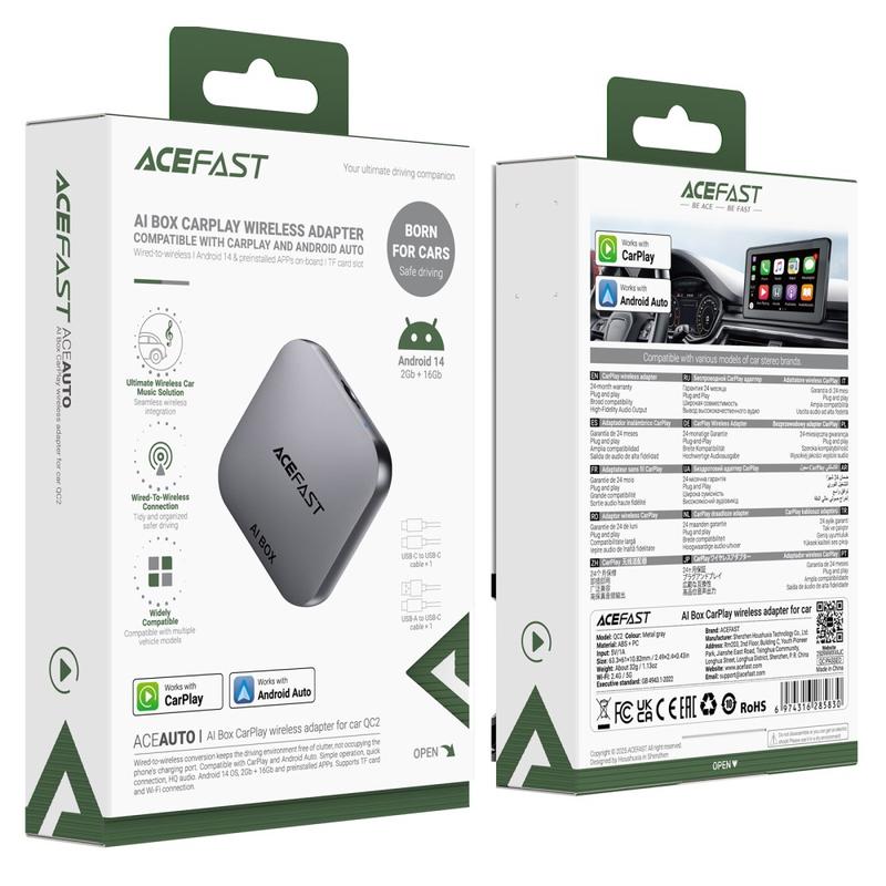ACEFAST QC2 AI Box antaa ajoneuvollesi välittömän modernin päivityksen korvaamatta pääyksikköäsi. Sen nopea langaton liitettävyys, viihdeominaisuudet, kannettava muotoilu ja tallennustilan laajennus tekevät siitä erinomaisen ratkaisun kuljettajille, jotka haluavat mukavuutta, mukavuutta ja joustavuutta. Tämä kompakti sovitin parantaa jokaista matkaa riippumatta siitä, navigoitko, suoratoistatko tai soitatko puheluita handsfree-periaatteella.