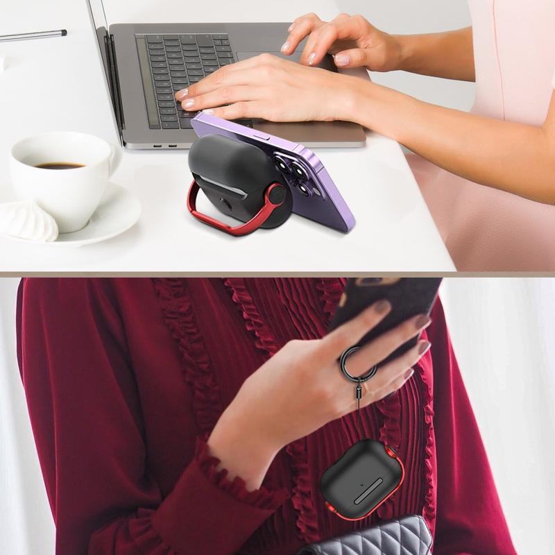 Integroitu metallirengas toimii sekä potkulaitteena handsfree-katselua varten että kantokoukkuna, jolla voit kiinnittää AirPodit laukkuihin, avaimiin tai vöihin.