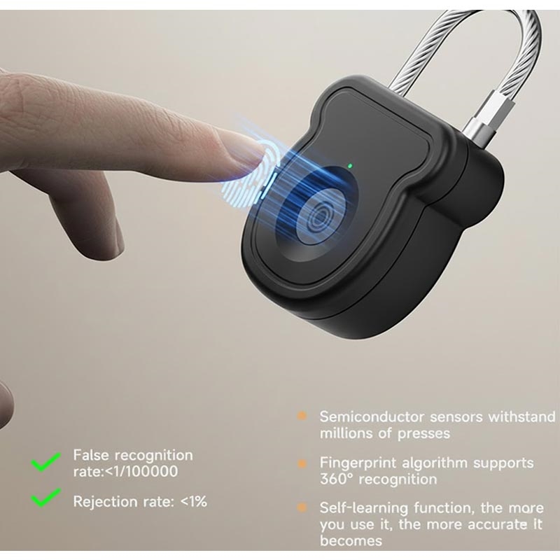 Älykäs sormenjälkilukko tarjoaa nykyaikaisen biometrisen turvallisuuden, kestävän varkaudenestorakenteen ja pitkän pariston käyttöiän - kaikki kompaktissa, helppokäyttöisessä rakenteessa. Ihanteellinen henkilökohtaisten tavaroiden turvaamiseen kotona, töissä tai matkoilla.