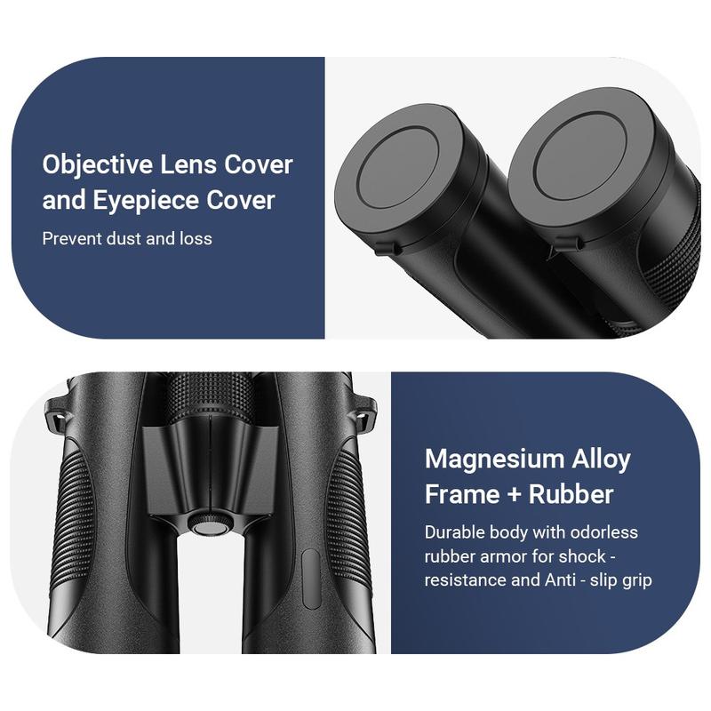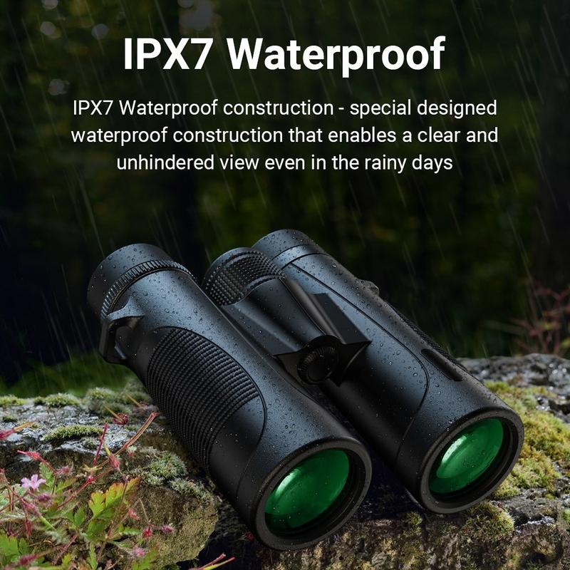 Nämä kiikarit on suunniteltu toimimaan kaikissa sääolosuhteissa, ja niissä on IPX7-vedenpitävyysluokitus, joka takaa selkeän näkymän myös rankkasateessa tai kosteissa olosuhteissa. Kumipäällysteinen ulkopinta tarjoaa turvallisen, liukastumista estävän otteen ja parannetun iskunkestävyyden kestävään ulkokäyttöön.