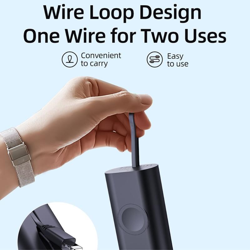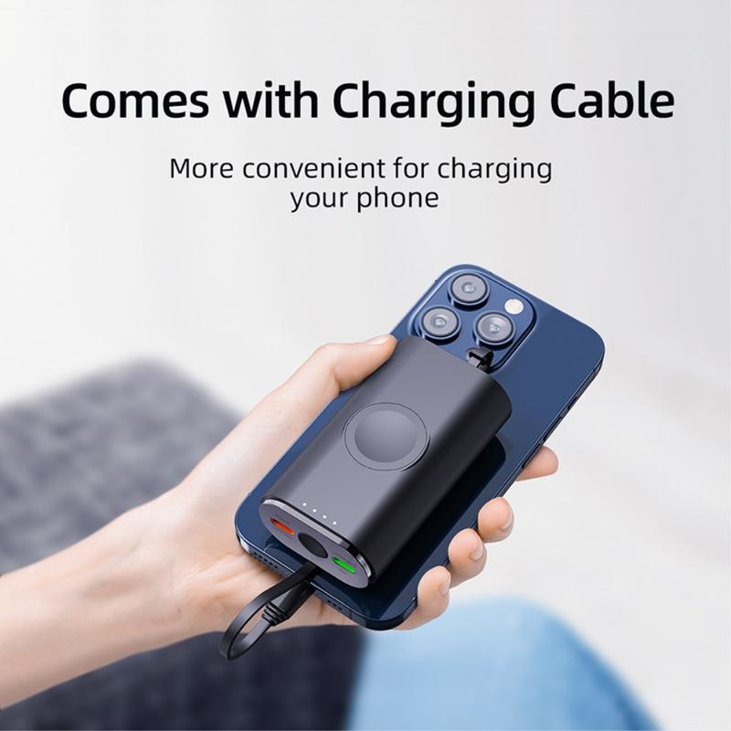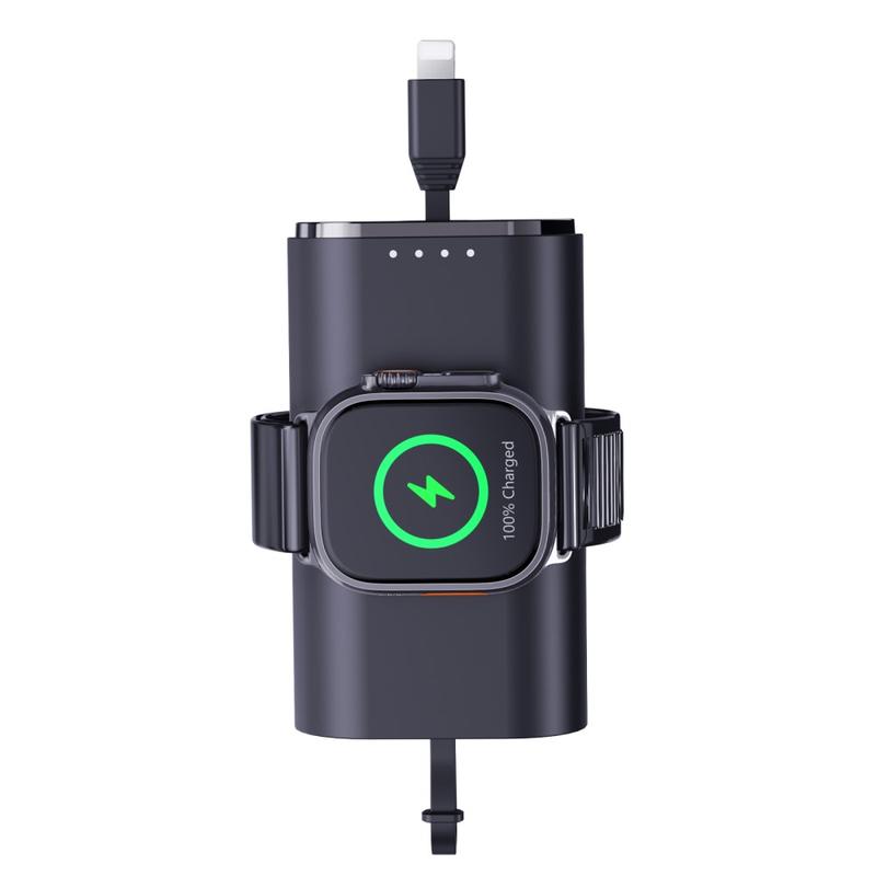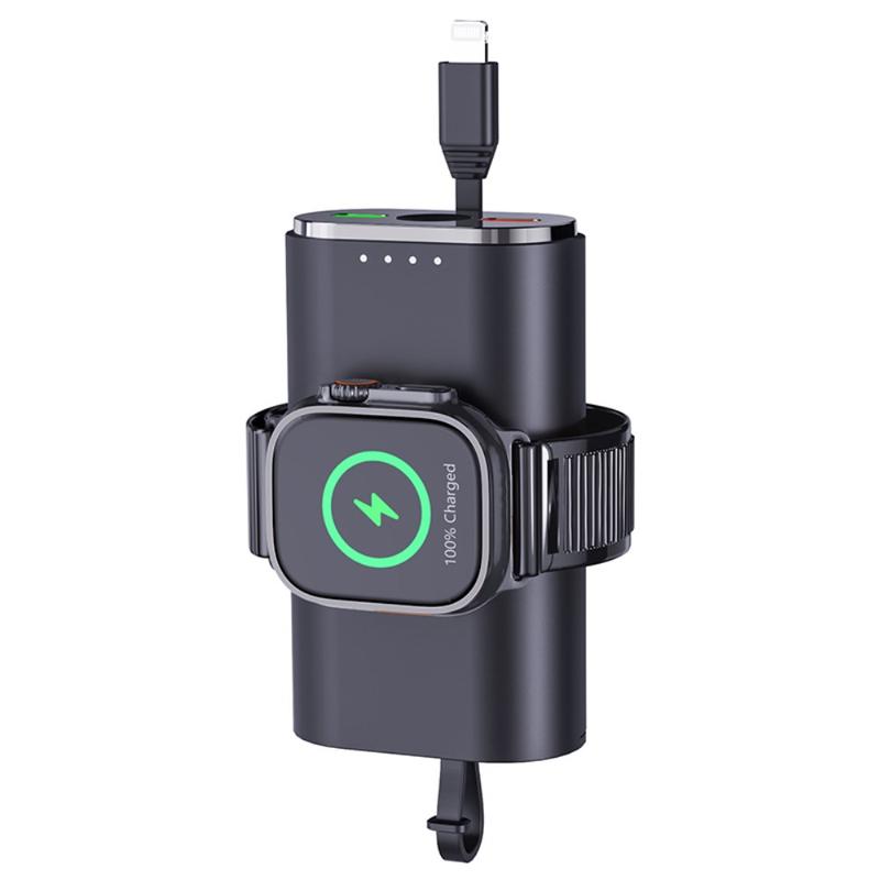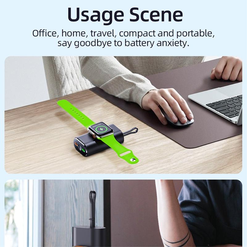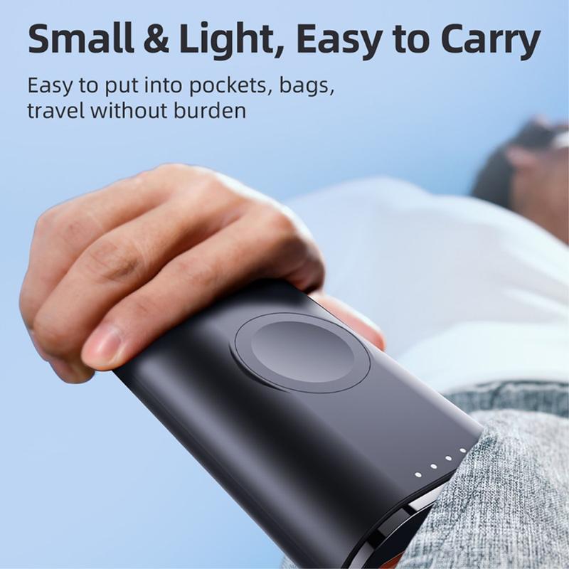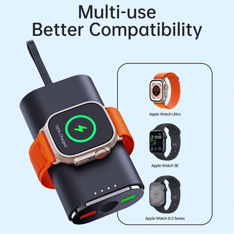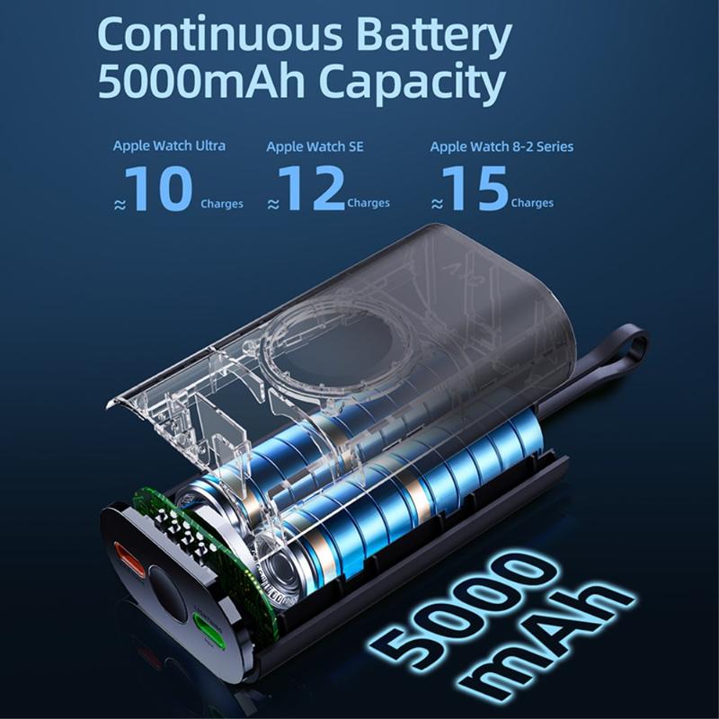 Sen 5000mAh:n kapasiteetti tekee siitä hyödyllisen varavirtalähteen matkoille, työmatkoille, työpäiville ja päivittäiseen kantamiseen. Sisäänrakennettu magneettinen latausalue auttaa pitämään Apple Watchin paikallaan latauksen aikana, kun taas mukana toimitettu kaapeli ja kompakti, kevyt muotoilu helpottavat sen säilyttämistä laukussa, taskussa tai pöydällä.