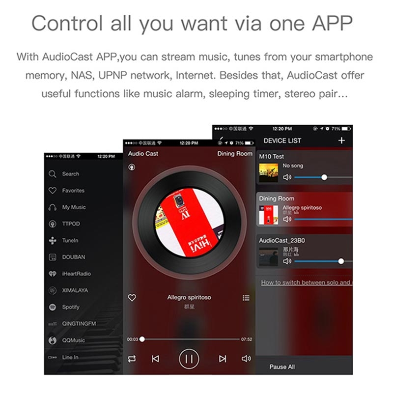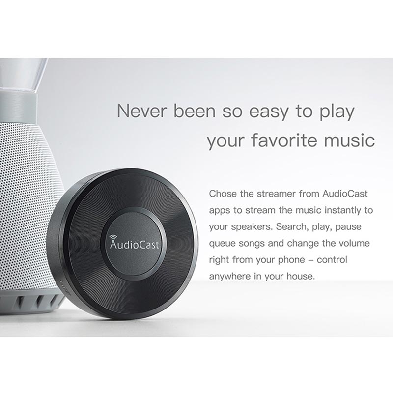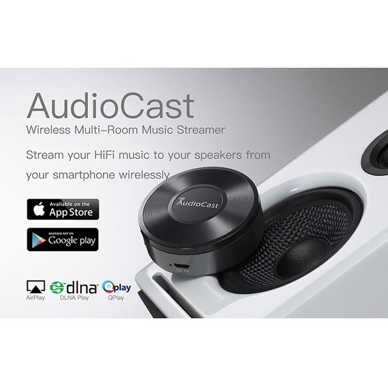 Audiocast M5 saa virtansa DC 5V / 1000mA:sta, ja se liitetään kaiuttimiin tai audiojärjestelmiin 3,5 mm:n äänilähtöliitännän avulla, joten se on yhteensopiva monenlaisten virtakaiuttimien, äänijärjestelmien ja vahvistimien kanssa.