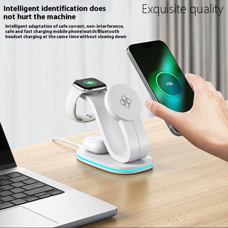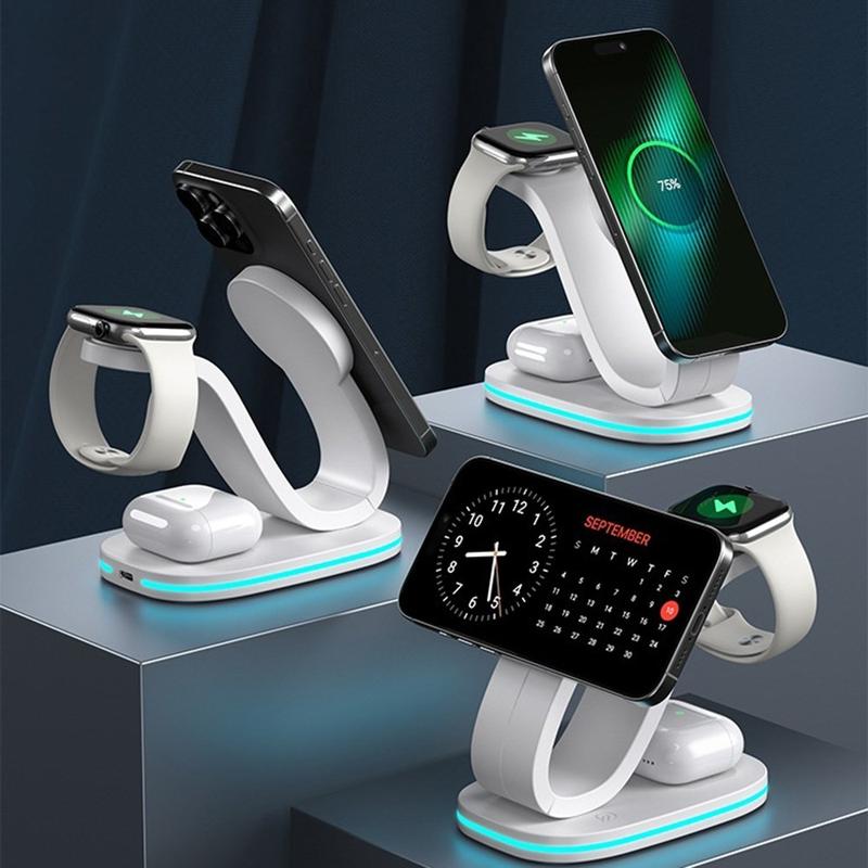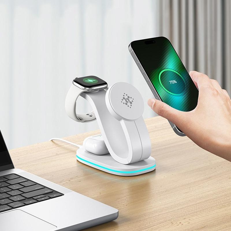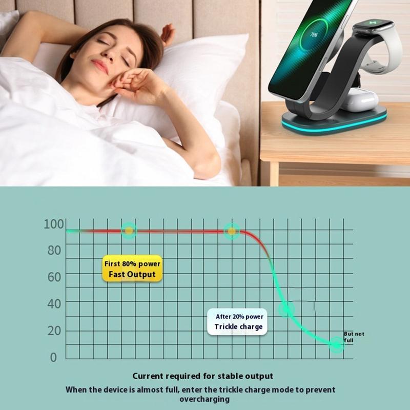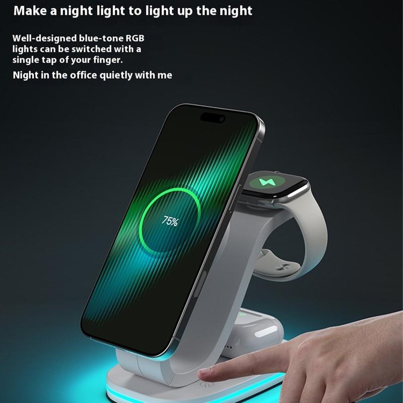 Vähennä pöydän ääressä olevaa sotkua yhdellä jalustalla, joka tarjoaa nopean 15 W:n langattoman latauksen, lataa älykellosi 2 W:n teholla, syöttää korvakuulokkeesi 3 W:n teholla ja toimii myös lempeänä yövalona.
