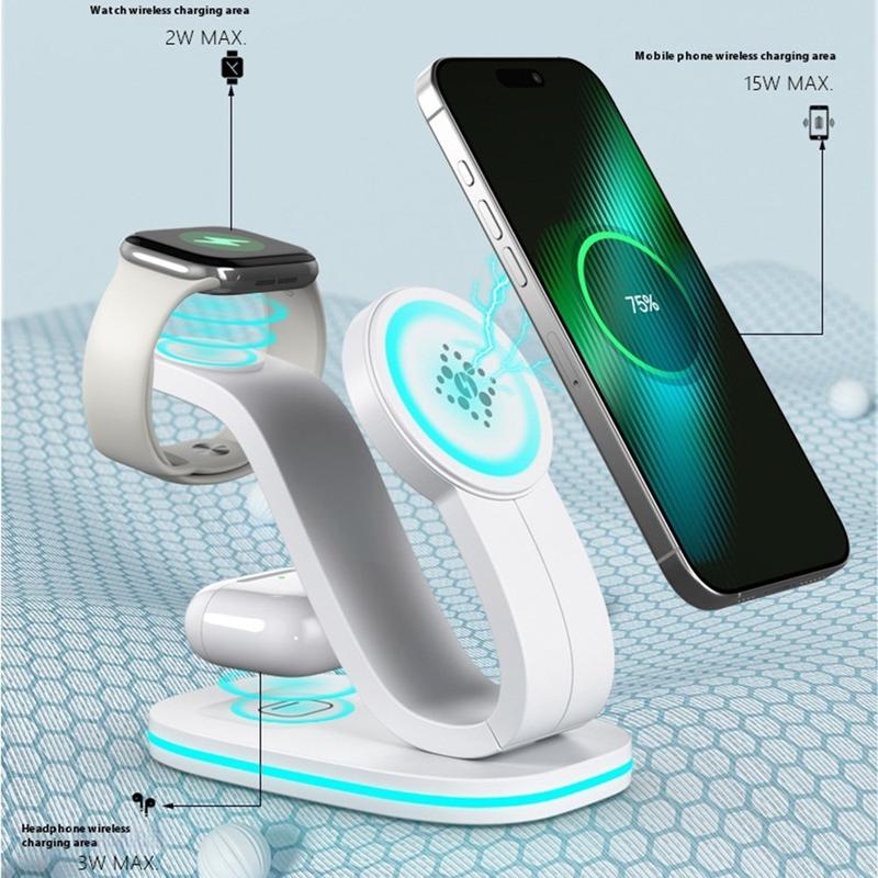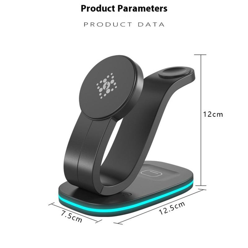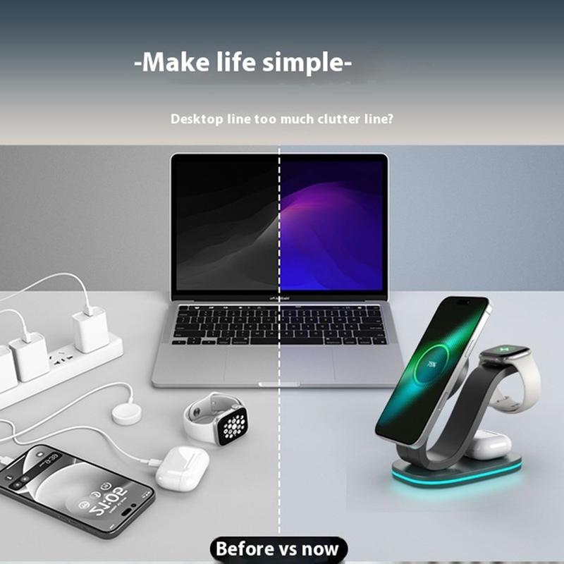 Vähennä pöydän ääressä olevaa sotkua yhdellä jalustalla, joka tarjoaa nopean 15 W:n langattoman latauksen, lataa älykellosi 2 W:n teholla, syöttää korvakuulokkeesi 3 W:n teholla ja toimii myös lempeänä yövalona.