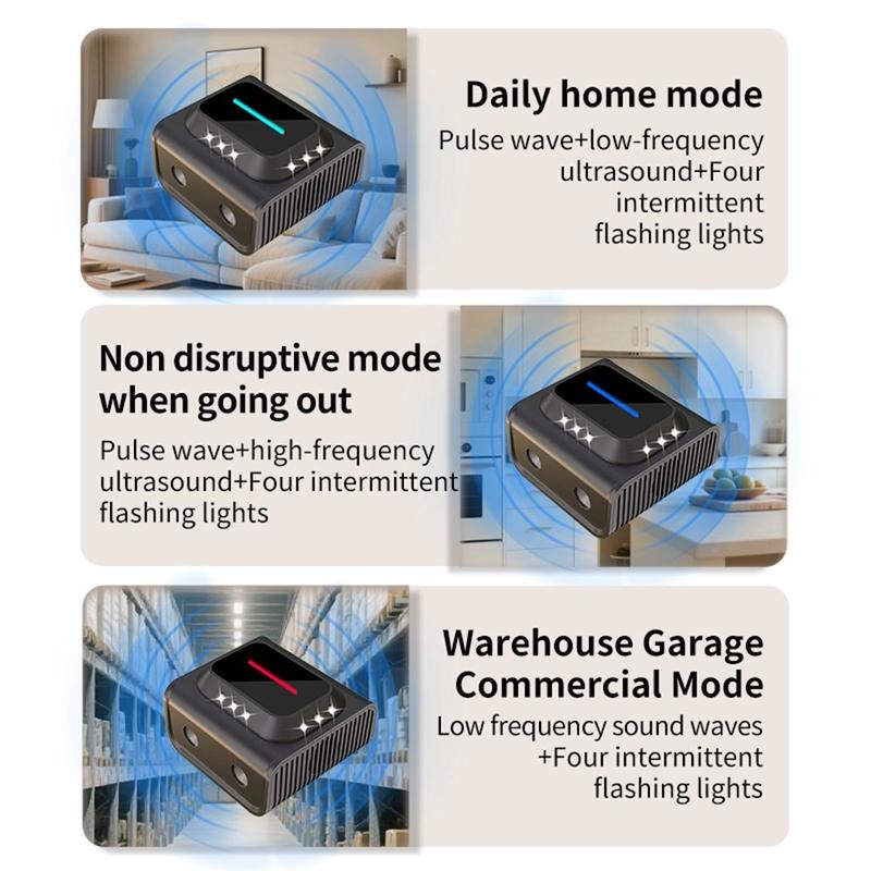 Yhdistämällä ultraääniaallot, kaksoispulssiset paineaallot ja voimakkaan LED-stroboskoopin laite luo erittäin epämiellyttävän ympäristön tuholaisille ja on samalla turvallinen ihmisille ja lemmikeille.