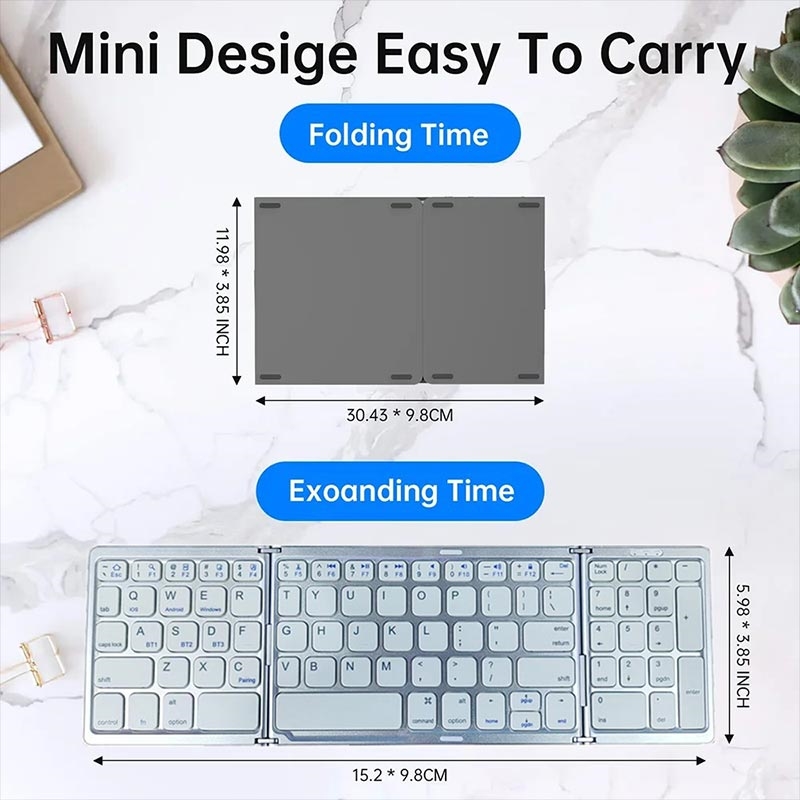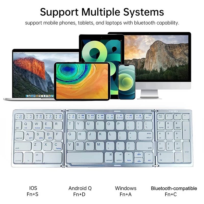 Älykäs kolmiosainen muotoilu helpottaa kantamista laukussa, repussa tai kannettavan tietokoneen suojakotelossa, ja magneettinen suljin pitää sen turvallisesti taitettuna kuljetuksen aikana. Koska näppäimistö tukee jopa kolmea Bluetooth-laitetta, voit vaihtaa sujuvasti puhelimen, tabletin ja kannettavan tietokoneen välillä erillisten BT1-, BT2- ja BT3-näppäinten avulla. Tämä tekee näppäimistöstä erityisen hyödyllisen moniajoon eri laitteiden ja käyttöjärjestelmien välillä.