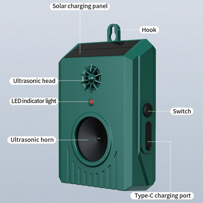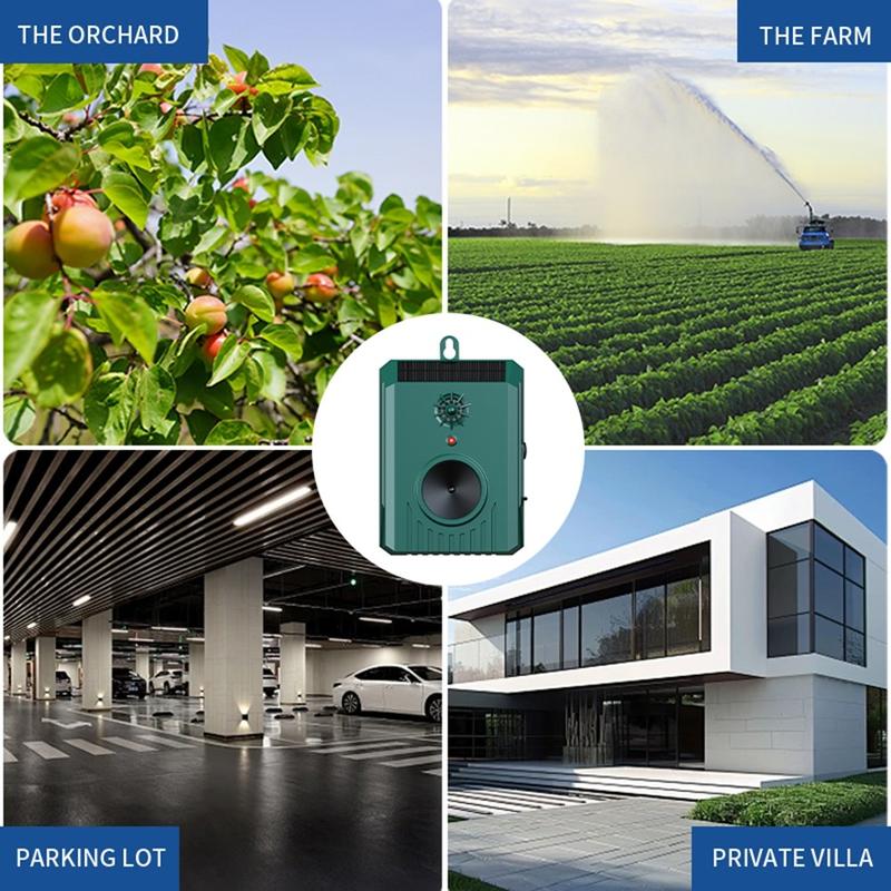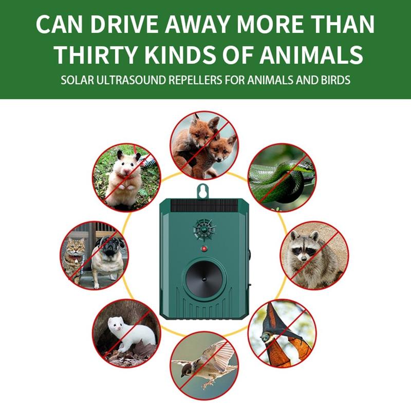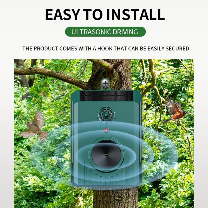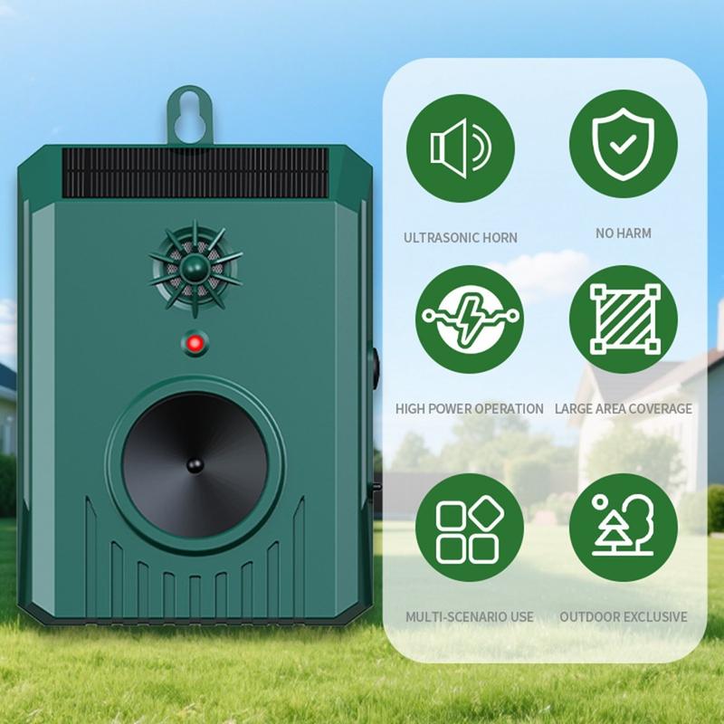 Yhdistämällä ultraääniaallot (8-35KHz) ja kuuluvan äänen laite karkottaa tehokkaasti lintuja, jyrsijöitä, lepakoita, koiria, oravia ja muita villieläimiä. Kaksitoiminen rakenne lisää karkotuksen onnistumisprosenttia laajemmalla tuholaisten valikoimalla.