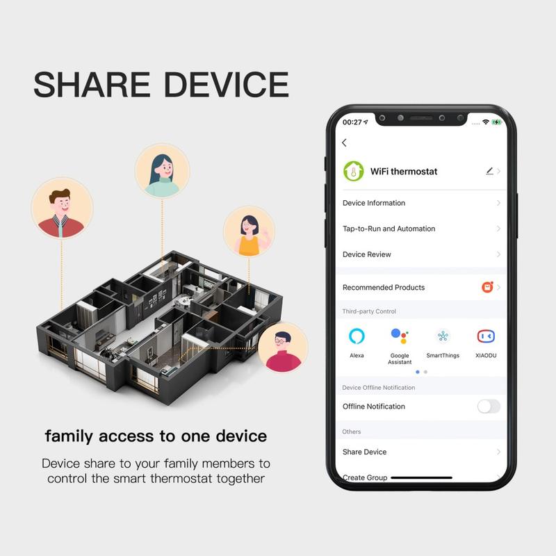 Tässä termostaatissa on 3,0 tuuman negatiivinen LCD-näyttö, joka tekee lämpötilalukemista helposti nähtäviä eri kulmista. Kapasitiivinen kosketuspaneeli tarjoaa sujuvan ja intuitiivisen käytön, mikä mahdollistaa asetusten nopean muuttamisen ilman monimutkaisia säätimiä. Sen pyöreä monivärinen navigointipainike lisää tyylikkään yksityiskohdan ja auttaa pitämään päivittäisen käytön yksinkertaisena ja käyttäjäystävällisenä.