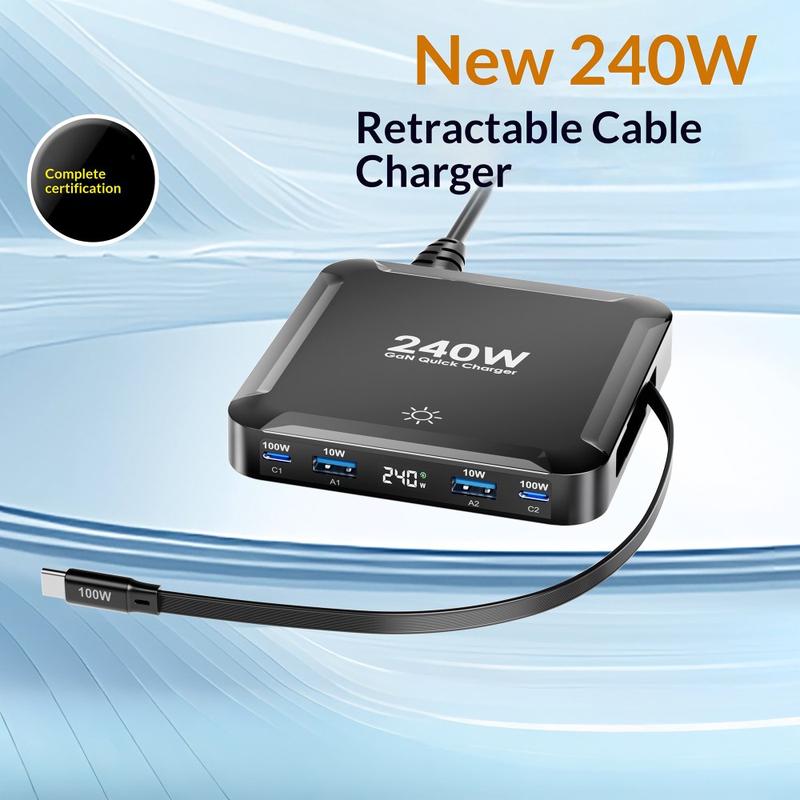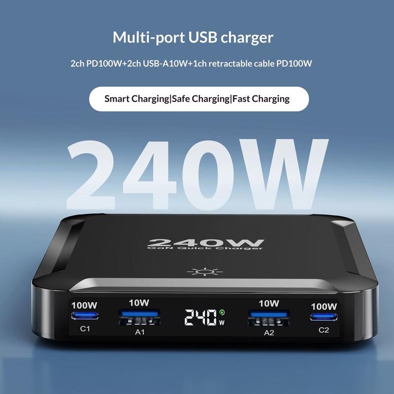 Lataa useita laitteita tehokkaammin BK-124D-pöytälatausasemalla, joka on käytännöllinen ja tehokas latauskeskus, joka on suunniteltu nykyaikaisille työpöydille, yöpöydille ja työtiloihin. Tämä kompakti 5-in-1-laturi tarjoaa jopa 240W:n kokonaistehon ja yhdistää 2 USB-C-porttia, 2 USB-A-porttia sekä sisäänrakennetun sisäänvedettävän USB-C-kaapelin, mikä tekee siitä erinomaisen ratkaisun puhelimien, tablettien, kannettavien tietokoneiden, kuulokkeiden, varavirtalähteiden ja muiden jokapäiväisten laitteiden lataamiseen yhdestä keskitetystä pisteestä.