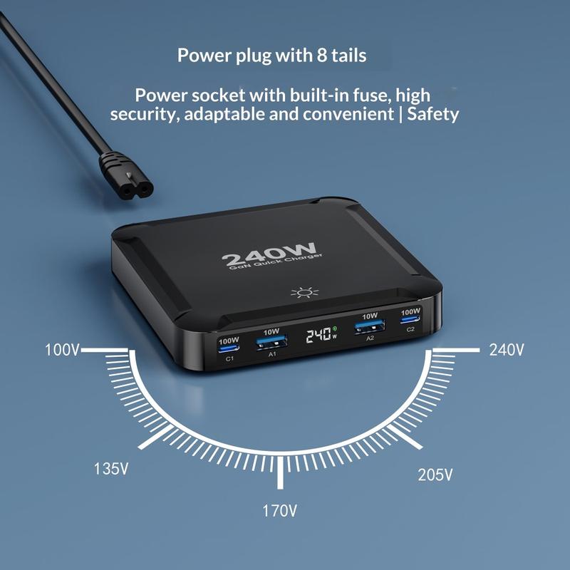 BK-124D 240W:n pöytälatausasema on moniporttinen pikalaturi, jossa on 2 USB-C-porttia, 2 USB-A-porttia ja sisäänrakennettu sisäänvedettävä USB-C-kaapeli. LED-virranäytöllä, älykkäällä turvasuojauksella, laajalla 100-240 V:n tulojännitteellä ja kompaktilla pöytämallisella rakenteella varustettuna se on tehokas latauskeskus kannettaville tietokoneille, puhelimille, tableteille ja muille jokapäiväisille laitteille.