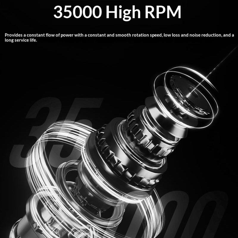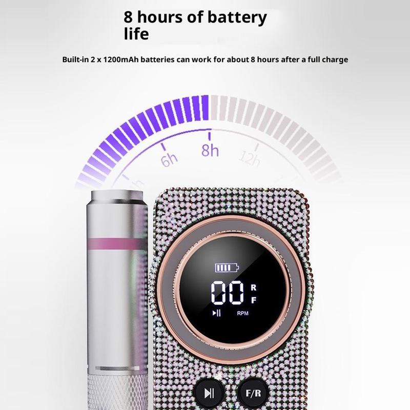 Nopealla moottorilla, joka saavuttaa jopa 35 000 kierrosta minuutissa, se tarjoaa sujuvan ja tasaisen toiminnan kynsien muotoiluun, viilaukseen, viimeistelyyn ja yleiseen kynsien hoitoon. LCD-näytön avulla on helppo seurata nopeutta, akun varaustasoa, pyörimissuuntaa ja taukotilaa, kun taas pikakiinnityskahva mahdollistaa poranterän vaihdon helposti ilman lisätyökaluja. Sen ladattava akku kestää jopa 8 tuntia, mikä tekee siitä käytännöllisen pidempiin hoitoihin kotona, kauneussalonkeissa tai matkoilla.