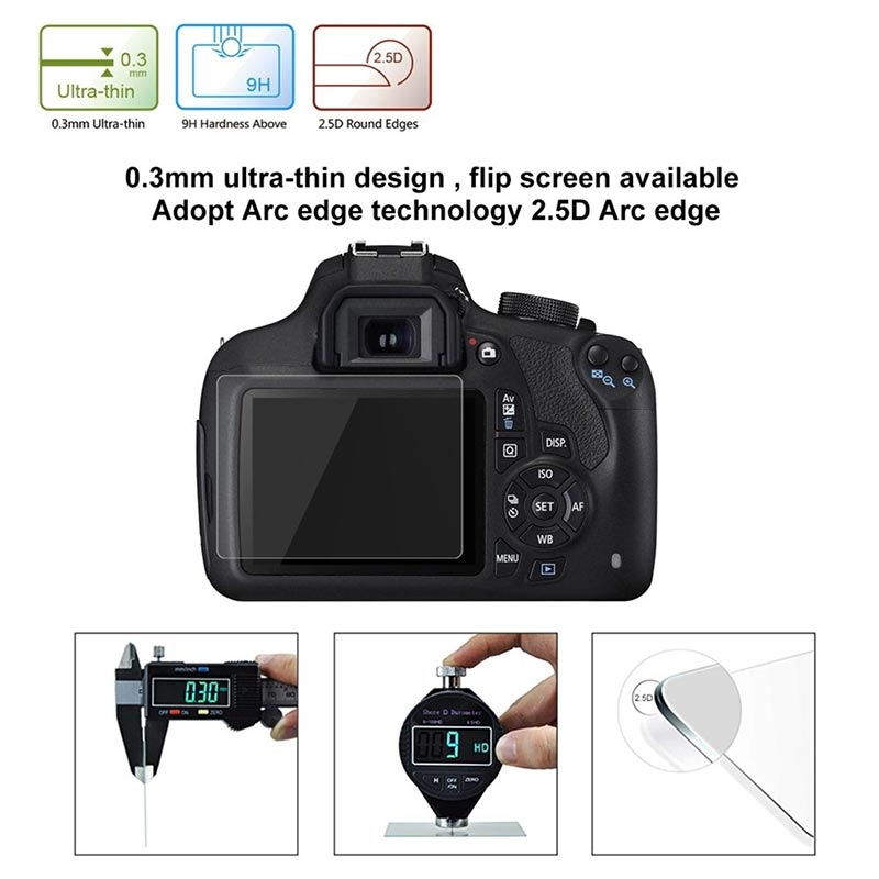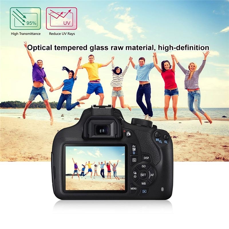 Suojaa kalliin Canon EOS 1200D, 1300D digitaalikamerasi näyttö vaurioilta ja naarmuilta ainutlaatuisesti käsitellyllä karkaistulla lasilla ja naarmuuntumattomalla materiaalilla.
