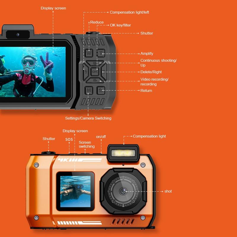 Vedenkestävä D50-toimintakamera on suunniteltu ulkoiluun, matkustamiseen ja vesiurheiluun. Siinä yhdistyvät kaksinäyttöinen muotoilu, helppokäyttöisyys ja pitkä käyttöaika. Käytä etupuolella olevaa 1,44 tuuman IPS-näyttöä selfien ottamiseen ja vloggaamiseen ja takapuolella olevaa 2,88 tuuman IPS HD -näyttöä kuvien sommittelemiseen, toistamiseen ja nopeaan katseluun. IP68-luokituksen mukainen vedenkestävyys 10 metriin asti tekee siitä sopivan uima-altaalle, snorklaamiseen ja sateisiin vaelluksiin. Luovat kuvaajat rakastavat 20 erityistä suodatintehostetta, kun taas elektroninen tärinänvaimennus auttaa pitämään kuvamateriaalin tasaisempana liikkuessasi. Sisäänrakennettu SOS-yhden napsautuksen toiminto lisää mielenrauhaa ulkoilma-aktiviteeteissa. Tämä sarja sisältää myös 32 Gt:n TF-kortin ja kortinlukijan, joten voit aloittaa kuvaamisen heti.