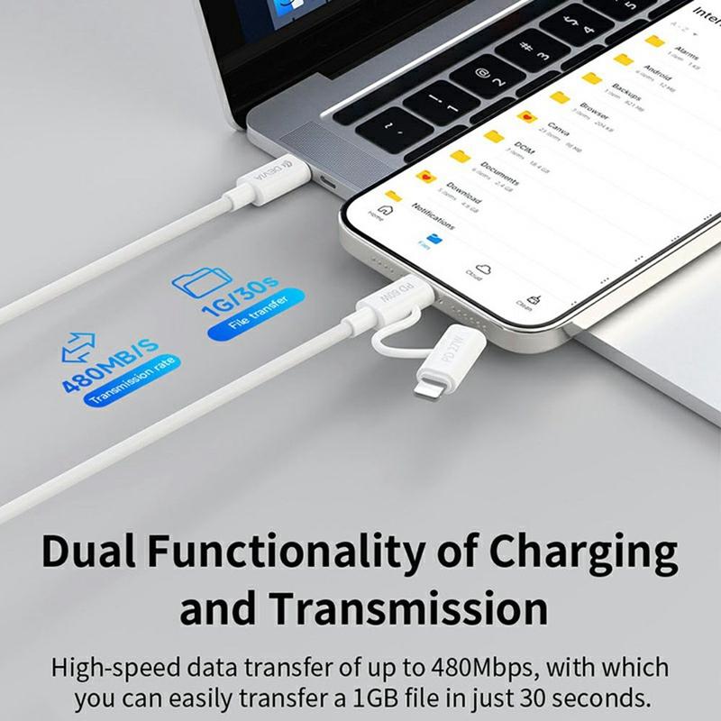 - 2-in-1-liitinrakenne: lataa USB-C-laitteita ja Lightning/IP-laitteita yhdellä kaapelilla