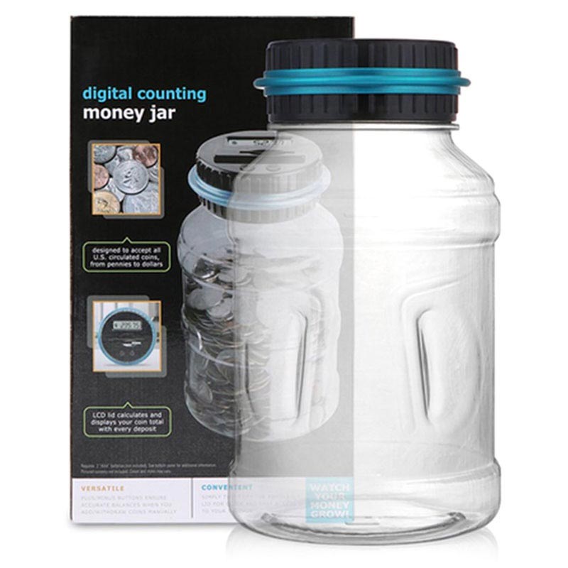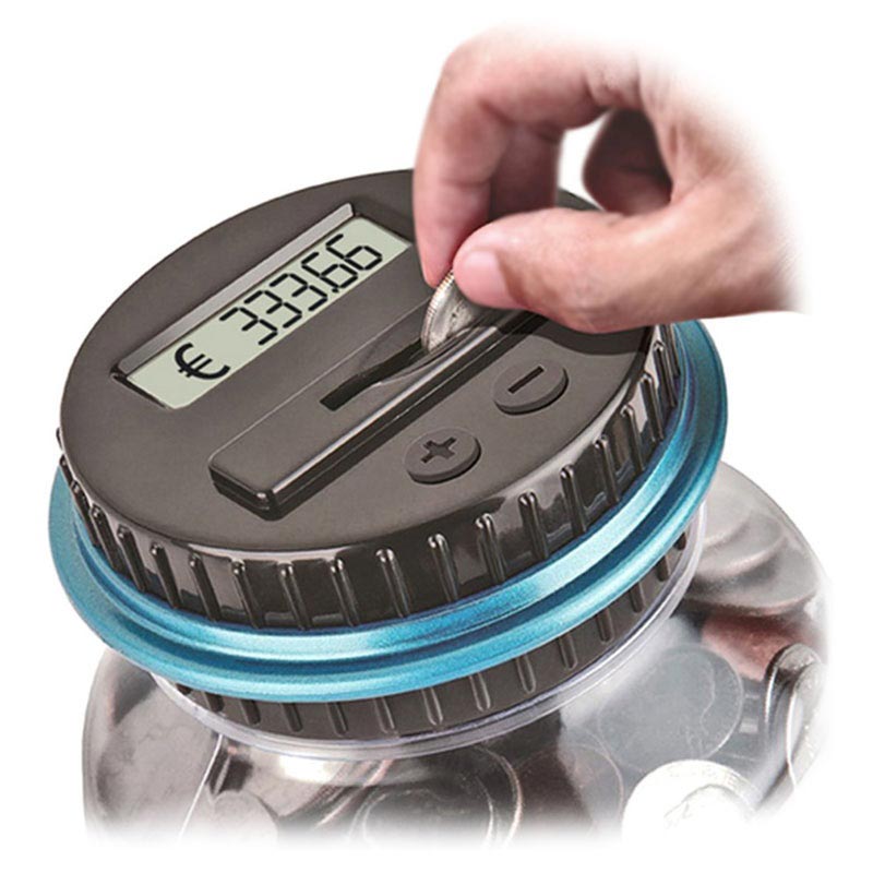 Jos säästät kolikoita klassisessa purkissa mutta olet kyllästynyt laskemaan kolikoita, täydellinen ratkaisu on tämä digitaalinen kolikkolaskuri. Tämä rahaa säästävä purkki on varustettu LCD-näytöllä ja kahdella painikkeella (+ ja -), jotka laskevat kolikot. Kun asetat kolikon, paina painiketta + ja näet näytössä, kuinka paljon kolikoita sinulla on.
