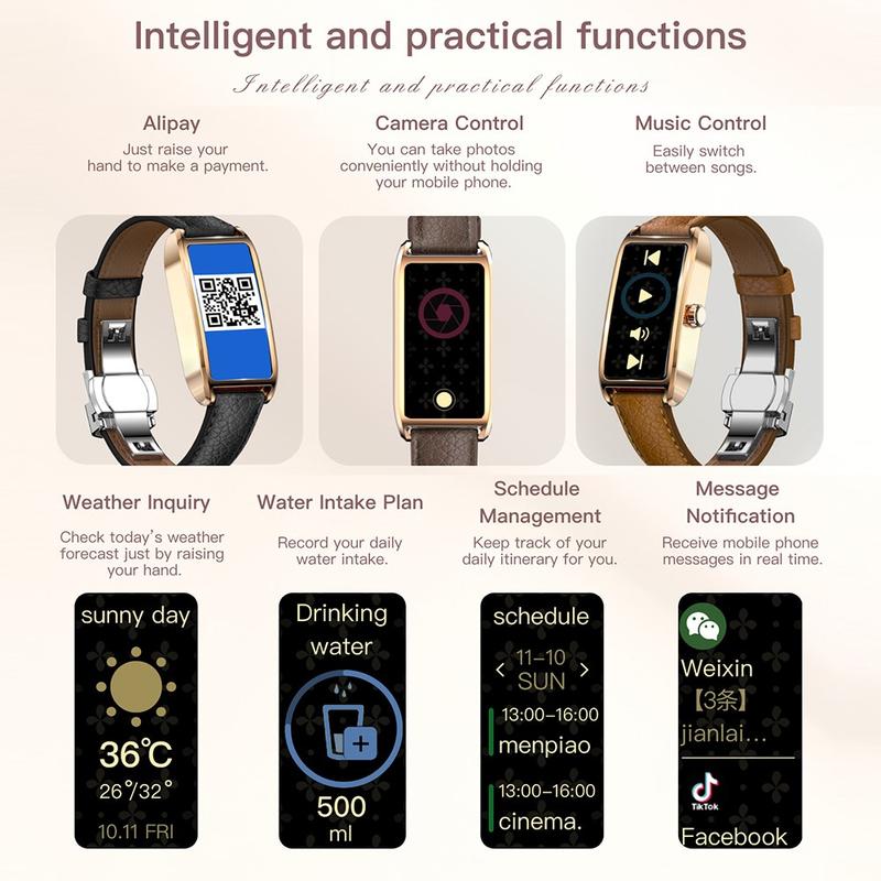 Pysy järjestyksessä ja yhteydessä useiden älykkäiden työkalujen avulla: Alipay-tuki, musiikin ohjaus, etäkamera, värinähälytykset, viesti-ilmoitukset, sääpäivitykset, nesteytysmuistutukset ja aikataulun hallinta. Erityisesti naisille suunniteltu laite sisältää myös kuukautiskierron seurannan ja yötilan näytön himmentämisen levollisia iltoja varten.
