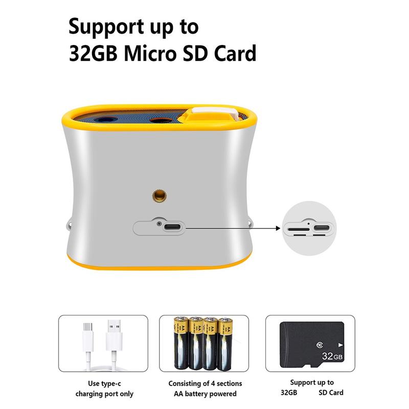 DT15 saa virtansa 4 × AA-paristolla tai Type-C-latauksella, joten se on kätevä matkoilla ja ulkokäytössä. Kevyen rakenteensa ja mukana tulevan kaulanauhan ansiosta lapset voivat kantaa sitä turvallisesti ja mukavasti. Tallennustila on laajennettavissa 32 GB:n microSD-kortilla (ei sisälly toimitukseen).