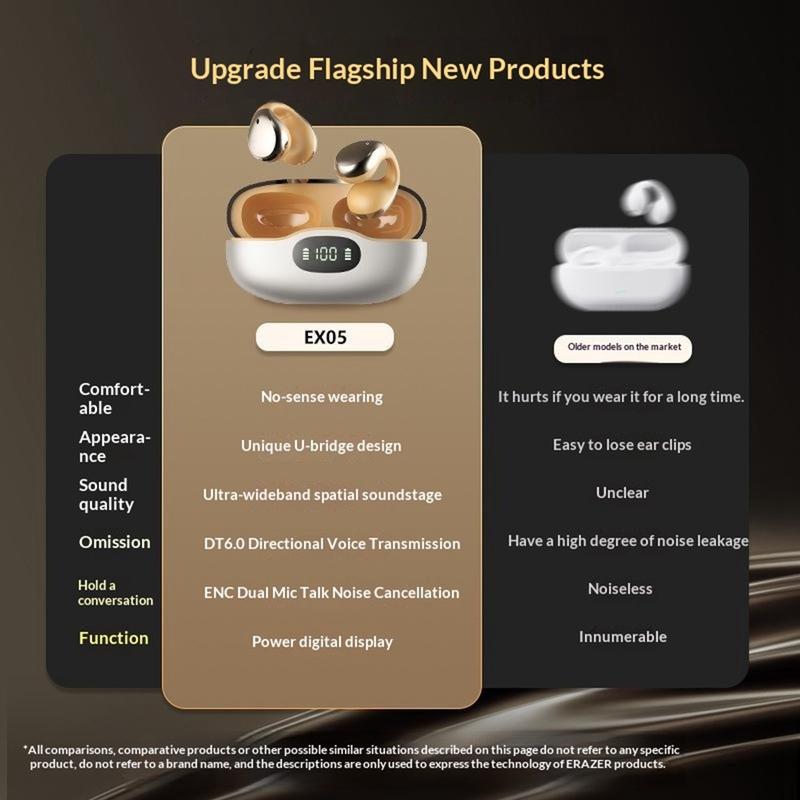 Nauti mukavasta päivittäisestä kuuntelukokemuksesta ERAZER EX05 -kiinnitettävien langattomien kuulokkeiden avulla. Nämä langattomat kuulokkeet on suunniteltu kevyiksi ja avoimiksi kiinnitettäviksi, joten ne istuvat mukavasti ilman, että ne painavat korvakäytävää, mikä tekee niistä käytännöllisen valinnan urheiluun, kävelyyn, työmatkoille ja päivittäiseen käyttöön.