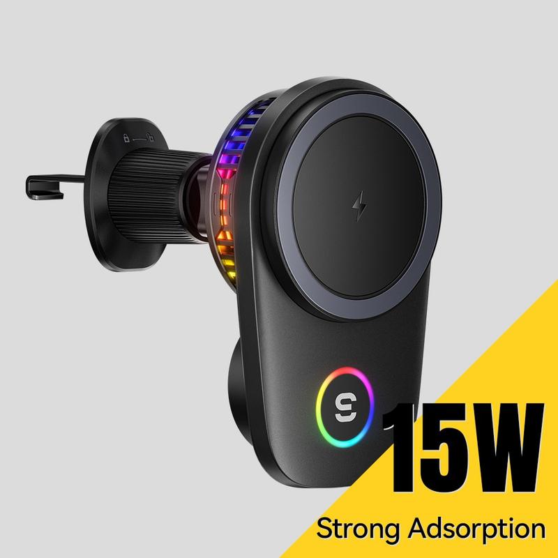 Essager 15W:n magneettinen langaton laturi/autoteline, jossa on tuuletin, RGB-valaistus ja tuuletusaukkoon kiinnitettävä pidike - MagSafe-yhteensopiva