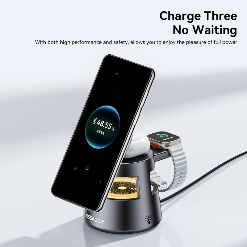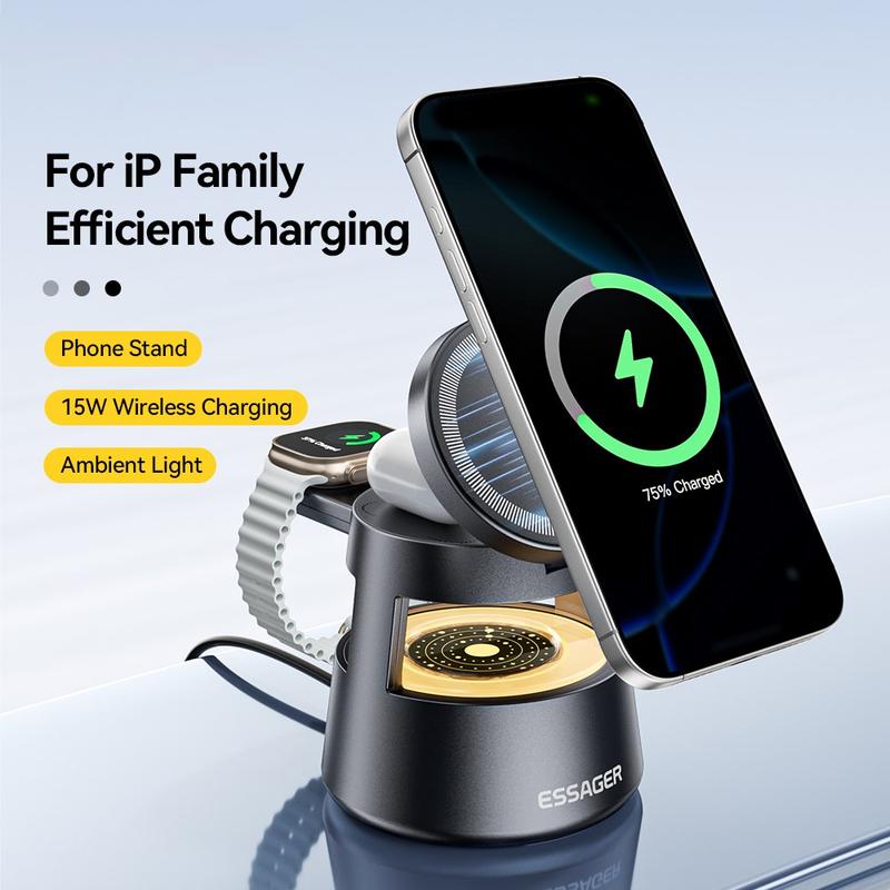 Tässä ESSAGER 4-in-1-laturissa yhdistyvät nopea lataus, magneettinen vakaus, pehmeä valaistus ja usean laitteen tuki yhdessä, tilaa säästävässä muotoilussa - täydellinen koti-, toimisto- tai yöpöytäkäyttöön.