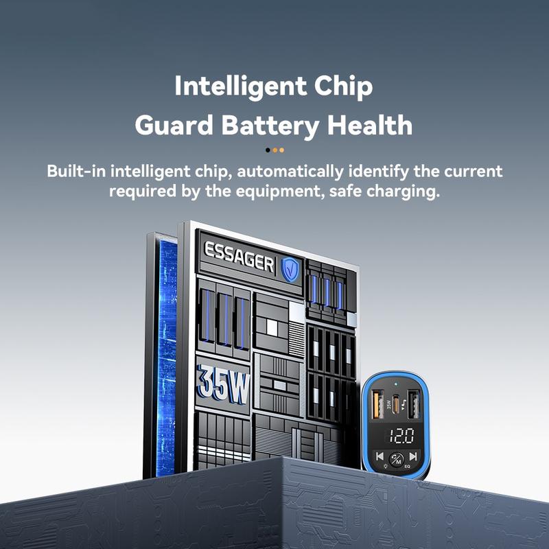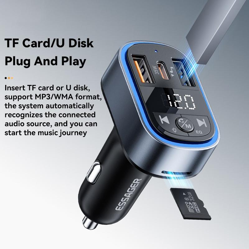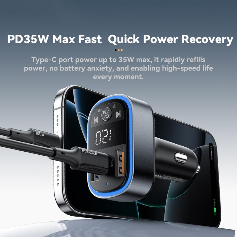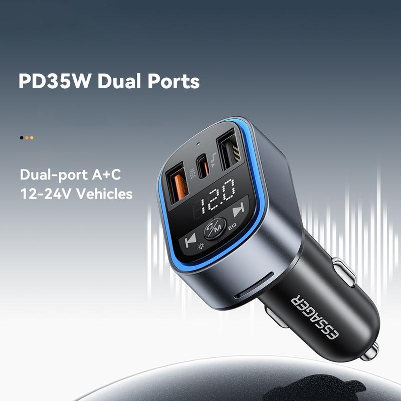 Essager ECCFM-CT0G-P 35W PD-pikalatausautolaturi, jossa on kaksi porttia USB-C/USB-A, Bluetooth 5.3 FM-lähetin, HD-puhelumikrofoni