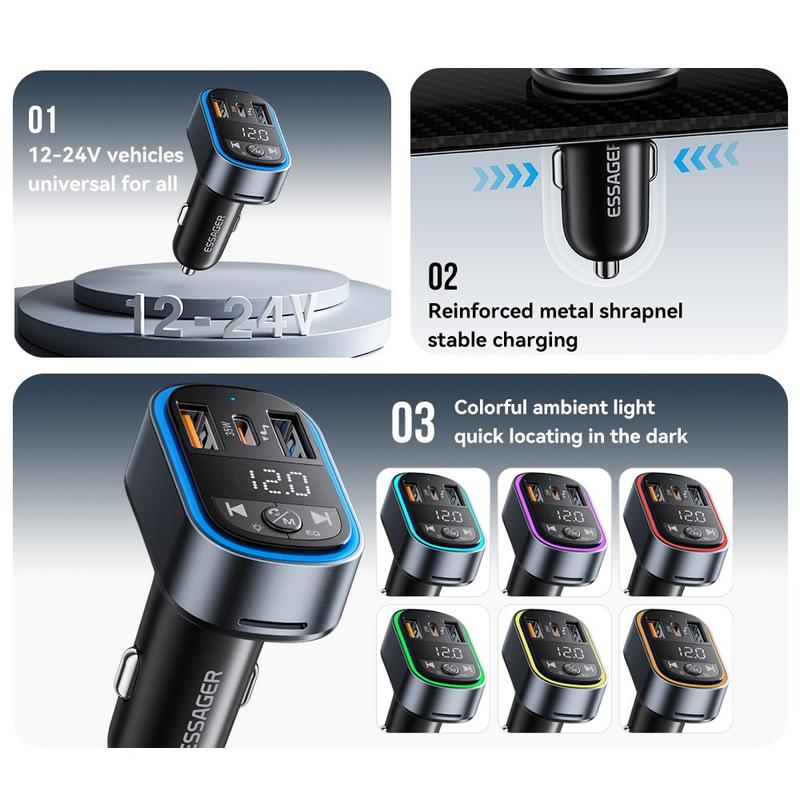 ESSAGER ECCFM-CT0G-P yhdistää pikalatauksen, langattoman Bluetooth 5.3 -suoratoiston, FM-lähettimen, HD handsfree-puhelut ja mediatoistotuen - kaikki yhdessä kompaktissa ja tyylikkäässä autovarusteessa. Täydellinen päivitys turvallisempaa ajamista ja parempaa viihdettä autossa varten.
