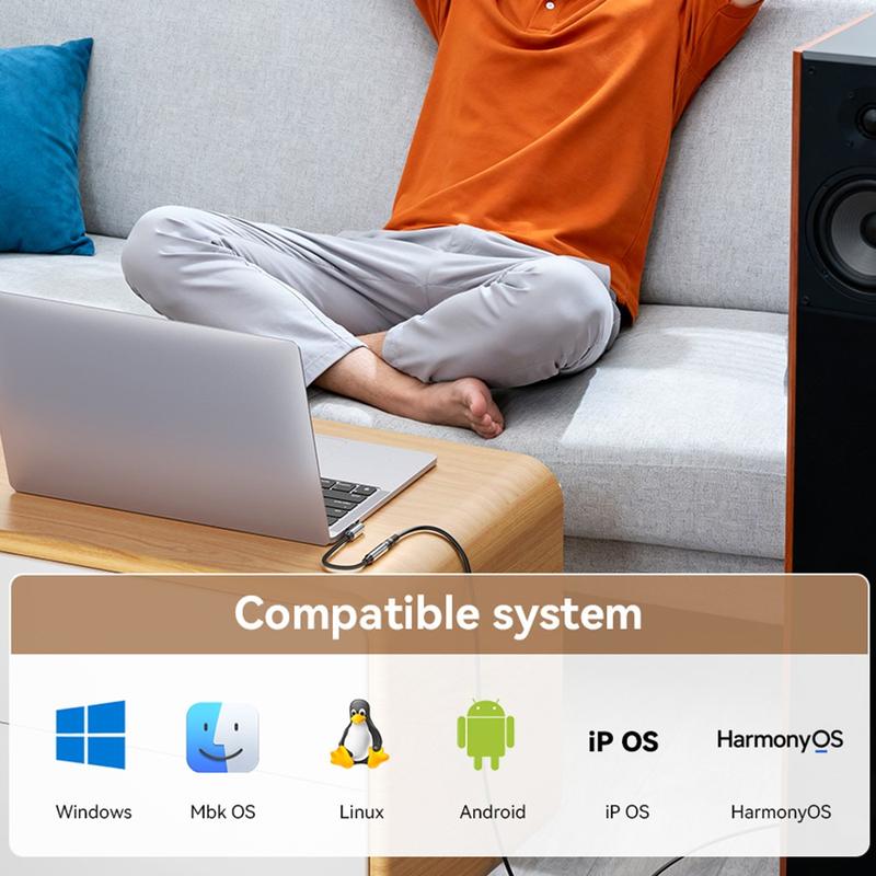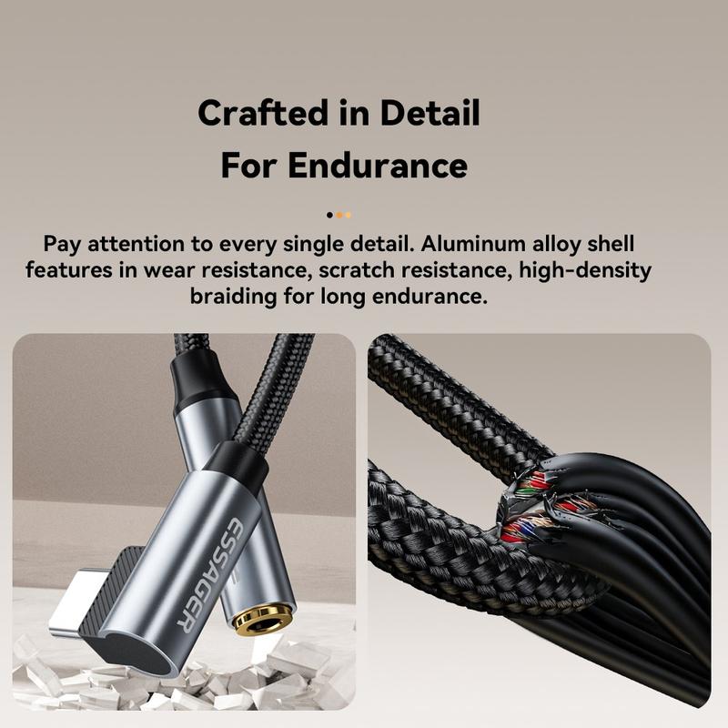 Sisäänrakennettu DAC-siru auttaa tuottamaan selkeän ja vakaan HiFi-äänen, kun taas 90 asteen L-muotoinen USB-C-liitin vähentää kaapelin rasitusta ja tuntuu mukavammalta pelaamisen, videoiden katselun tai päivittäisen käytön aikana. Sen alumiiniseoskotelo ja punottu kaapeli lisäävät myös kestävyyttä säännölliseen kantamiseen ja päivittäiseen käyttöön.