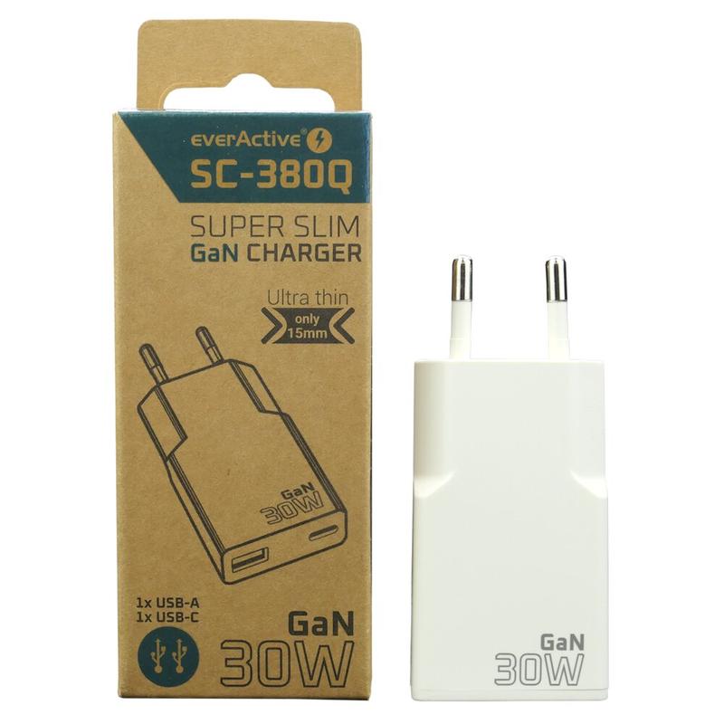 everActive SC-380Q GaN Super Slim 30W seinälaturi, jossa on USB QC3.0 & USB-C PD-portit