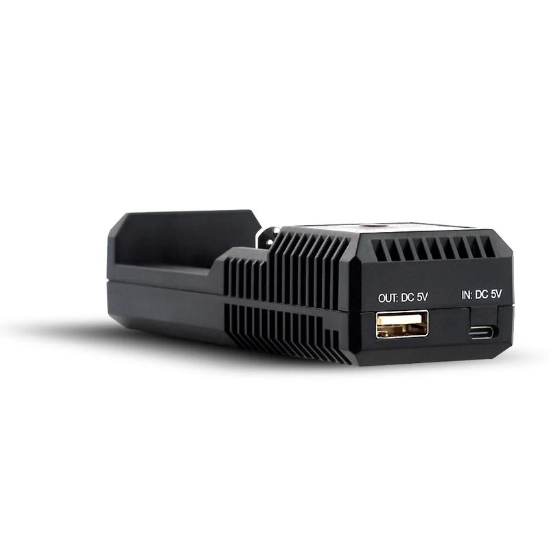 - Power Bank -toiminto - minkä tahansa Li-ion-kennon (esim. 18650, 20700, 21700) kanssa se toimii kannettavana USB-virtapankkina (5V/1A, max 1,5A).