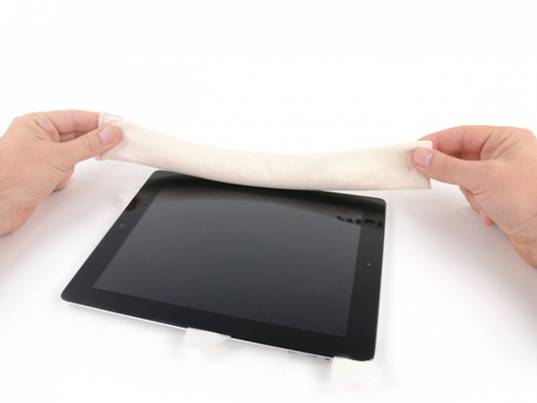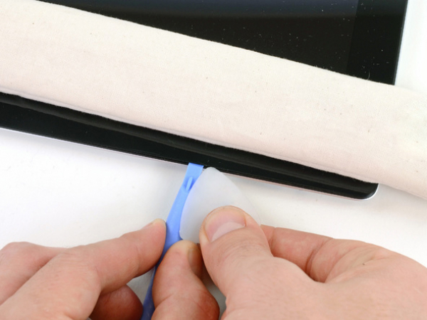 iPadin oikean yläkulman liimauksessa on pieni rako noin 5 cm:ä iPadin yläreunasta alaspäin. Hyödynnä tätä heikkoa kohtaa.