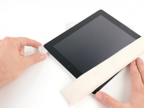 Aseta iOpener tasaisesti iPadin oikean puolen reunalla. Tasoita tyyny niin, että iPad ja iOpener koskettavat toisiaan hyvin.