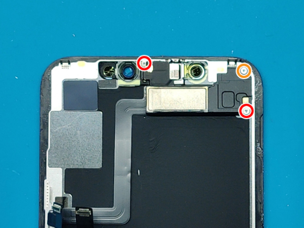 - Asenna anturikokoonpano ja kuuloke uuteen näyttöpaneeliin. - Kiinnitä se 3 Y000-ruuvilla. - Liitä OLED-paneelin kaapeliliitin logiikkakorttiin. - Liitä etuanturikokoonpanon kaapeliliitin logiikkakorttiin. - Asenna metallikiinnike ja kiinnitä se kuudella 1,3 mm Y000-ruuvilla. - Liitä akkuliitin takaisin ja asenna metallikiinnike. - Kiinnitä se kahdella 1,3 mm Y000-ruuvilla.
