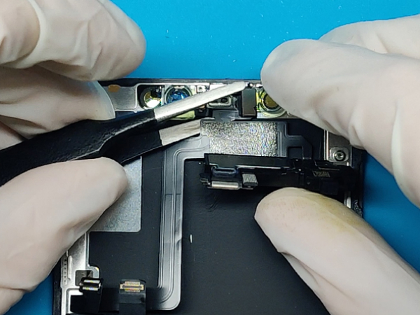 - Irrota mikrofoni ja paneelin lovi nostamalla sitä pinseteillä tai spudgerilla. - Poista ympäristön valoanturi näytön lovesta.
