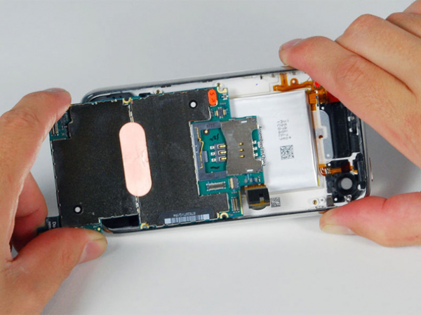 Kun laitat emolevyn takaisin akun asennuksen jälkeen, liitä kamera emolevyyn ennen kuin asetat sen kuoreen. Varmista sitten, että emolevyn yläosa (SIM-pidikkeen paikka) on paikoillaan ennen muun osan asettamista. Tämä on tärkeää, sillä joskus SIM-pidike ei kohdistu oikein. Kun yläosa on paikoillaan, alaosa voidaan asettaa paikoilleen. Emolevy on oikein asennettu, kun SIM-pidike on reiän kohdalla ja kamerayksikkö on siististi omalla paikallaan.