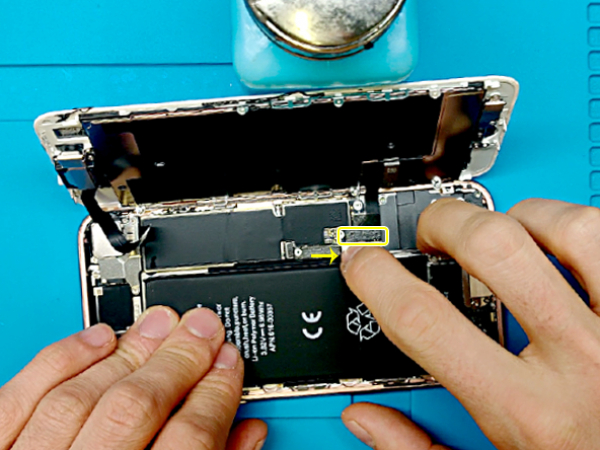 Irrota akkuliitin logiikkakortin pistorasiasta spudgerin kärjellä.