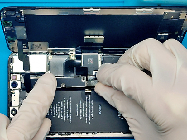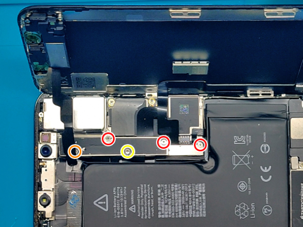 - Irrota viisi ruuvia, joilla logiikkakortin liittimen kiinnike kiinnitetään. - Kolme 1,0 mm Y000 -ruuvia. - Yksi 1,3 mm Y000 -ruuvi. - Yksi 3,7 mm ristipääruuvi. - Irrota liittimen kiinnike. - Akun liitin voidaan nostaa pois pistorasiasta käyttämällä avaustyökalun eli spudgerin kärkeä tai kynsiä. - Liitäntäjohtoa on taivutettava hieman, jotta se ei pääse kosketuksiin itse pistorasian kanssa, mikä voi johtaa puhelimen virraistumiseen.