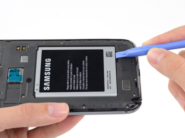 Käytä muovista avaustyökalua nostamaan akku syvennyksestä. Sinun tulee asettaa työkalu alaosan syvennykseen ja nostaa akkua ylöspäin.