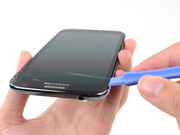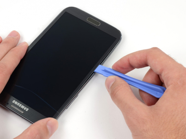 Aseta muovinen avaustyökalu puhelimen sivulla keskikehyksen ja etupaneelin väliin.