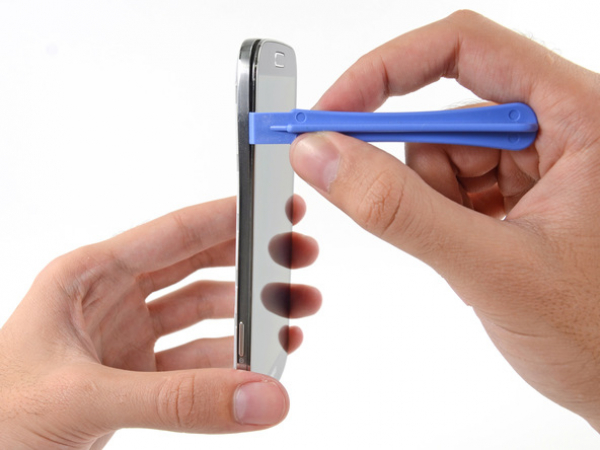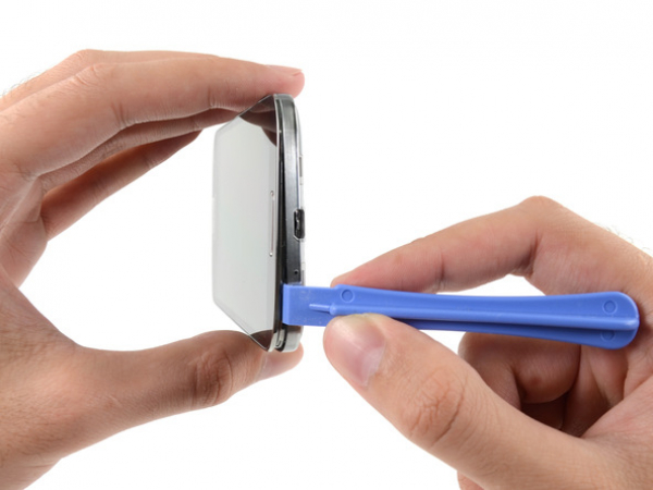 Aloita puhelimen äänenvoimakkuuden säätimen puoleiselta reunalta. Työnnä muovinen avaustyökalu kromikehyksen ja näytönlasin takaosan väliin.